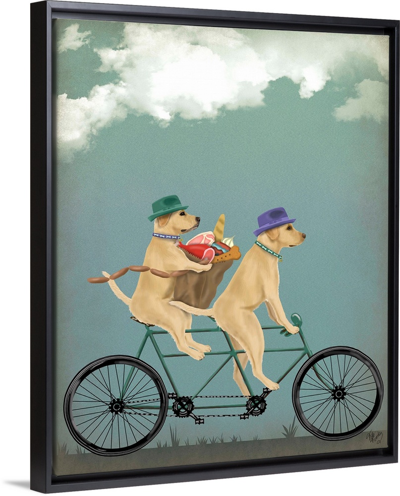 <p>Decorative artwork of two Yellow Labradors riding on a green tandem bicycle wearing hats and carrying groceries.</p>