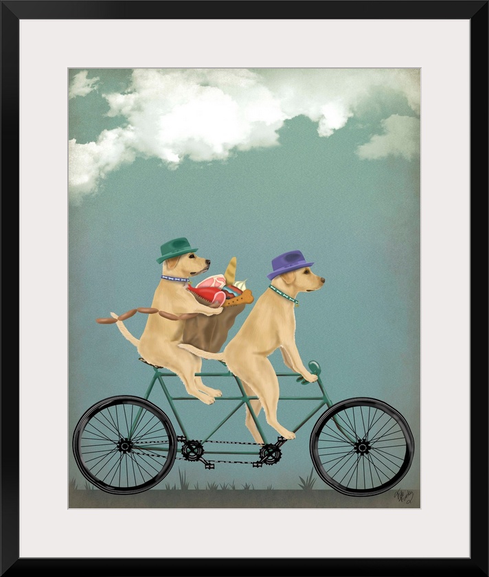 <p>Decorative artwork of two Yellow Labradors riding on a green tandem bicycle wearing hats and carrying groceries.</p>