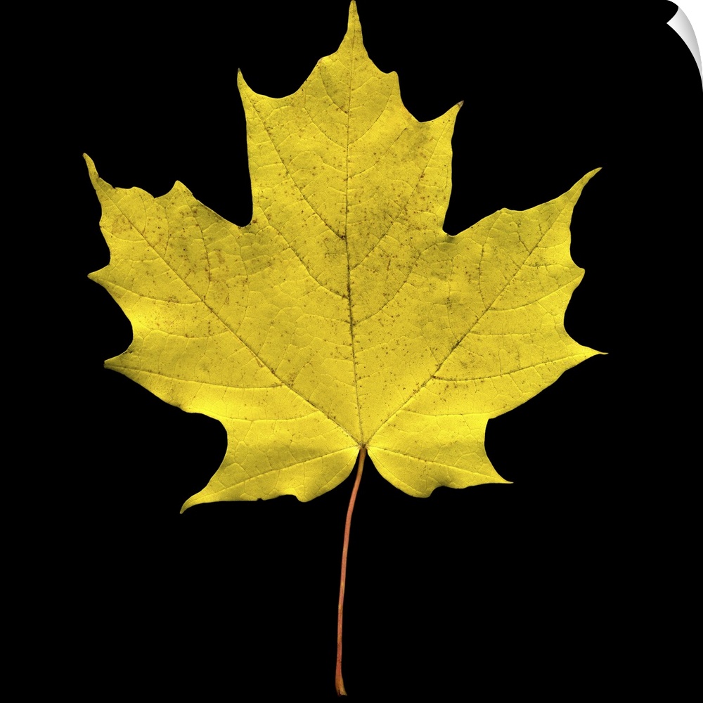 <p>A large yellow maple leaf is photographed closely against a black background.</p>
