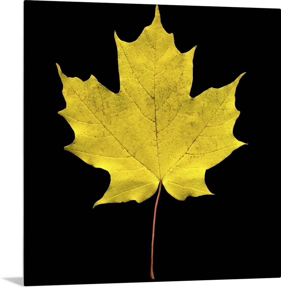 <p>A large yellow maple leaf is photographed closely against a black background.</p>