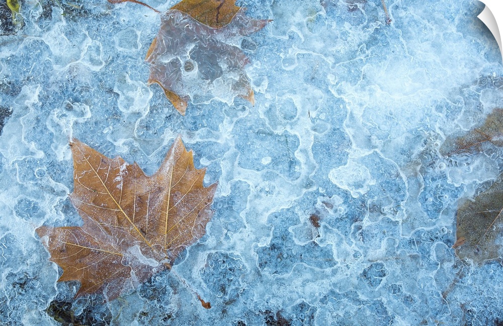 <p>Yellow maple leaves frozen in ice.</p>