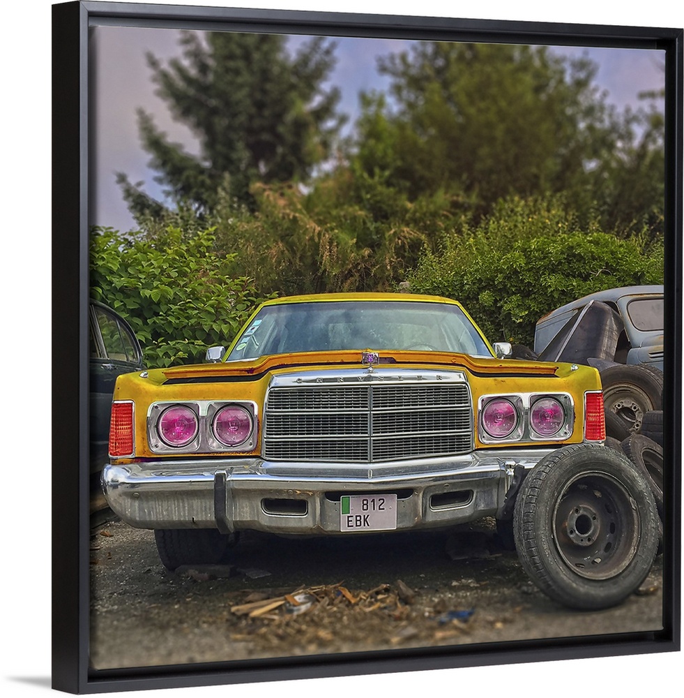 <p>Old yellow classic Chrysler car in salvage area in USA with spare wheels.</p>