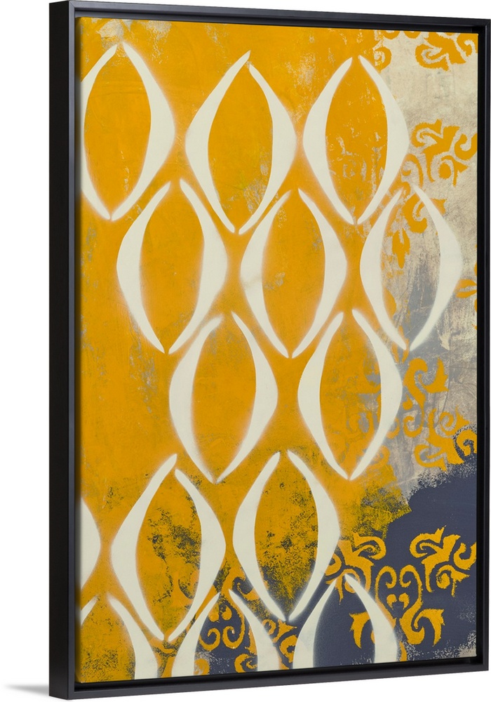 <p>Contemporary abstract painting created with grey and mustard yellow hues and repeating shapes.</p>