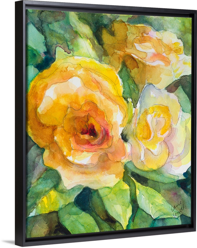 <p>Contemporary artwork featuring bright yellow watercolor flowers over a green foliage with mark making lines throughout.</p>