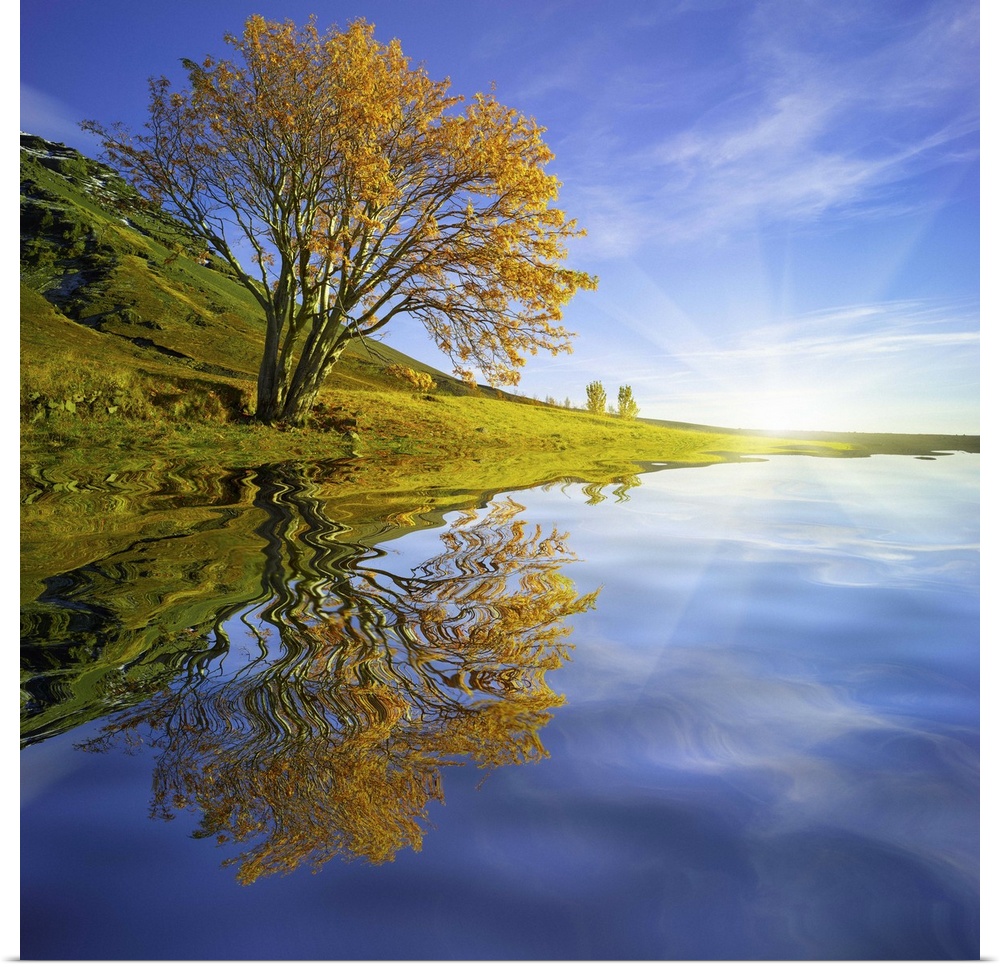 <p>An artistic photograph of a tree in fall foliage leaning over a lake casting a perfect reflection.</p>
