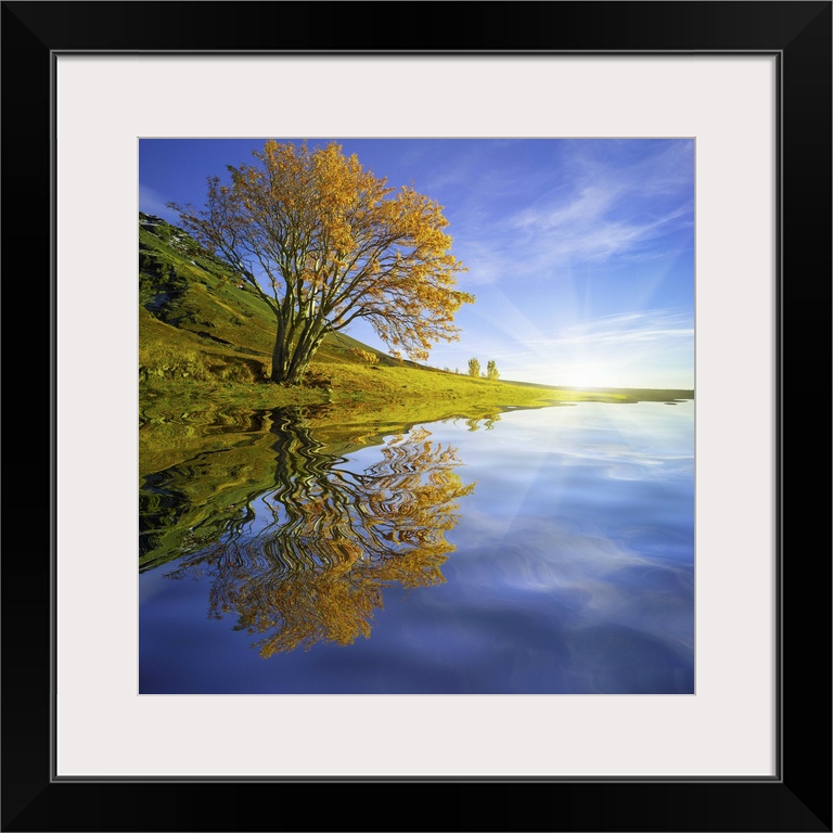 <p>An artistic photograph of a tree in fall foliage leaning over a lake casting a perfect reflection.</p>