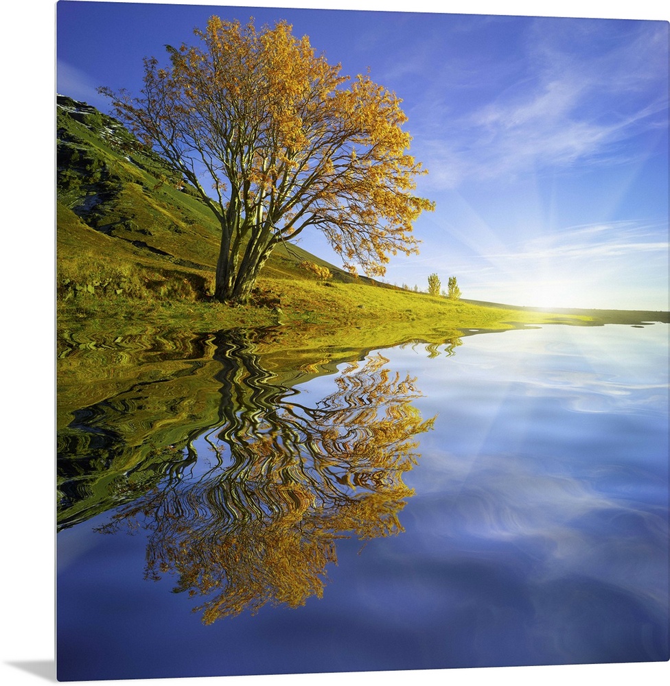 <p>An artistic photograph of a tree in fall foliage leaning over a lake casting a perfect reflection.</p>