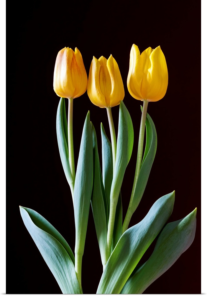 <p>Yellow Tulips Against A Black Background; Calgary, Alberta, Canada</p>
