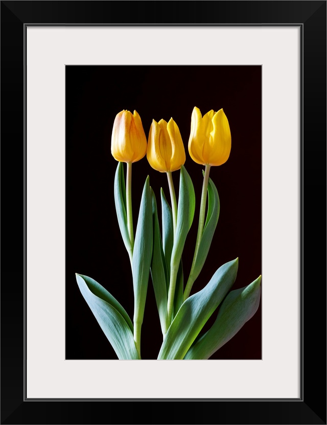 <p>Yellow Tulips Against A Black Background; Calgary, Alberta, Canada</p>