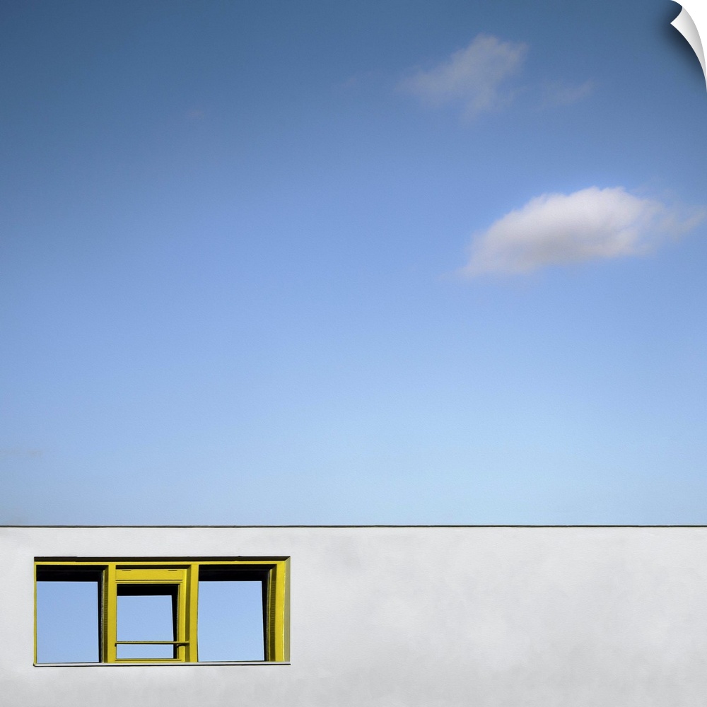 <p>Abstract view of a yellow framed window on a blank white wall facade, under a blue almost cloudless sky.</p>