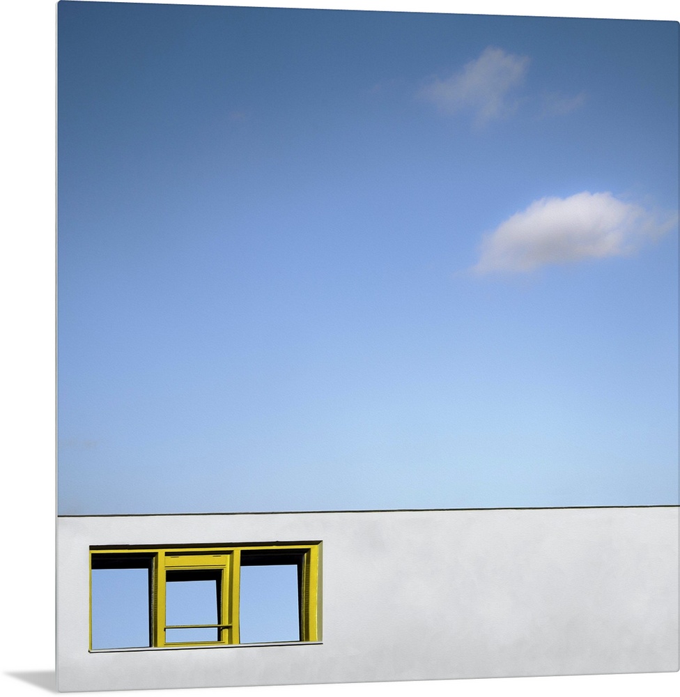 <p>Abstract view of a yellow framed window on a blank white wall facade, under a blue almost cloudless sky.</p>