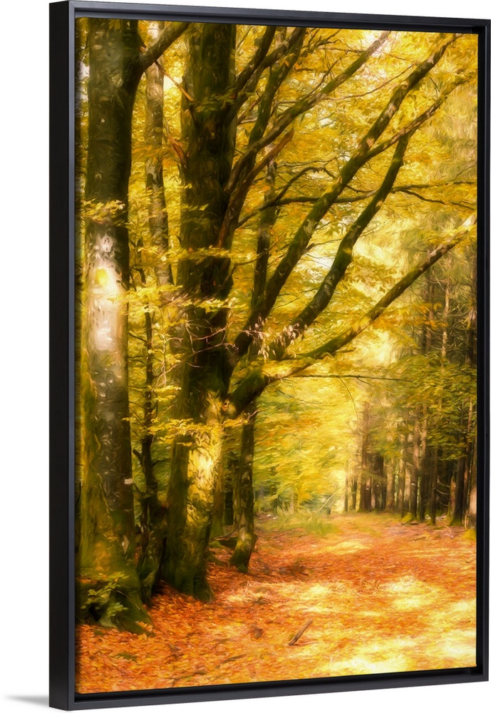 <p>Vertical photograph with a painted feel, of Autumn woods with yellow leaves on the trees and red leaves on the ground.</p>