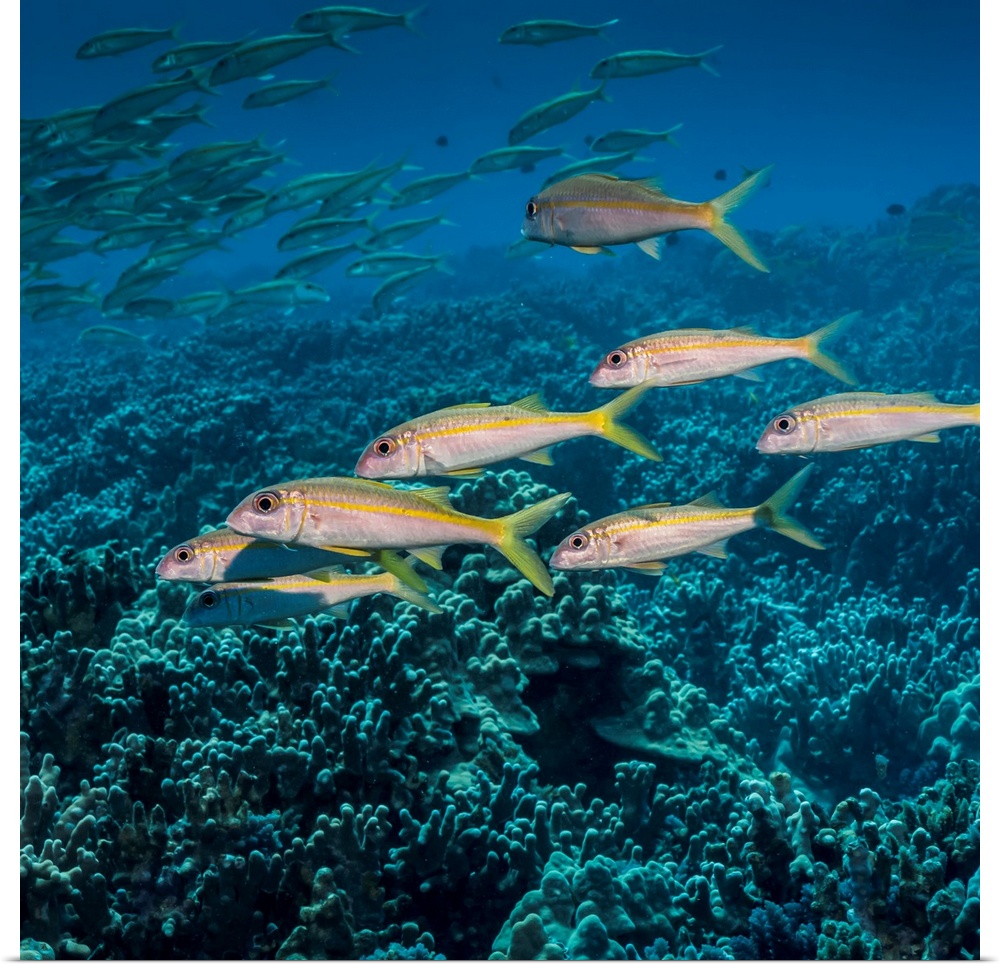 <p>Yellowfin Goatfish (Mulloidichthys vanicolensis) schooled off the Kona coast, Kona, Island of Hawaii, Hawaii, United States of America.</p>