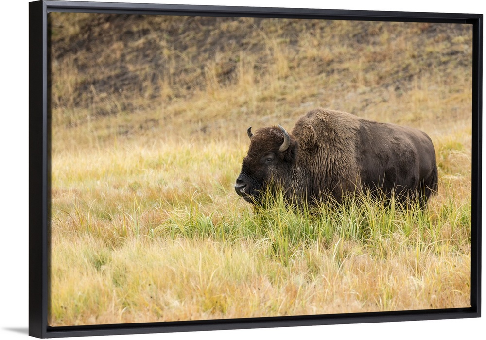 <p>Yellowstone National Park, Wyoming, USA. American bison grazing in tall grass.</p>