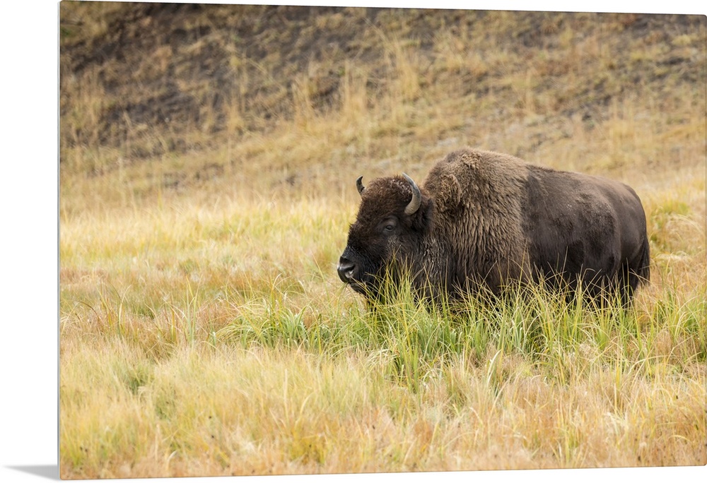<p>Yellowstone National Park, Wyoming, USA. American bison grazing in tall grass.</p>