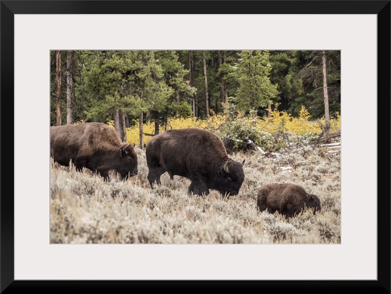 <p>Yellowstone National Park, Wyoming, USA. Bison family walking in Lamar Valley.</p>