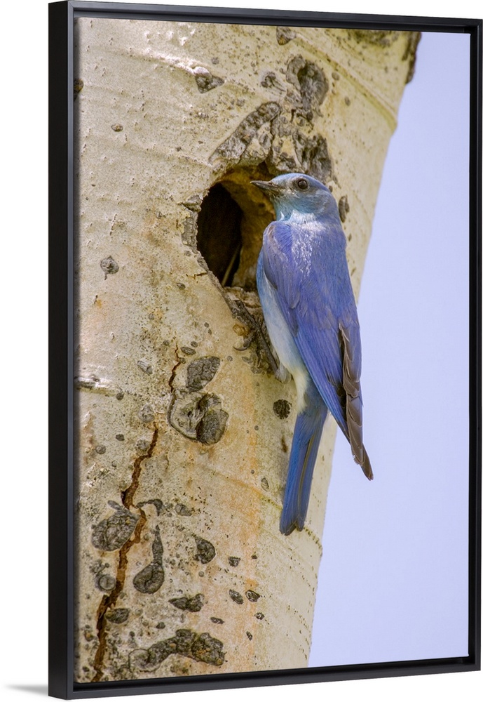 <p>Yellowstone National Park, Wyoming, USA. Male mountain bluebird perched by its nesting hole on a paper birch tree.</p>