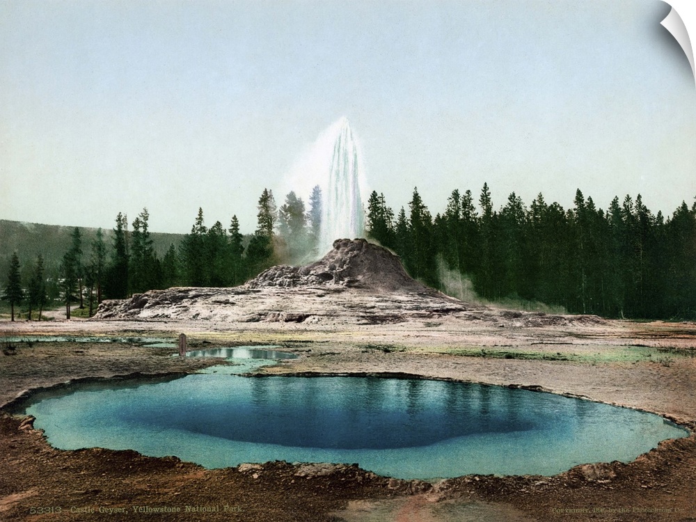 <p>Yellowstone Park, Geyser. View Of the Sinter Cone Castle Geyser Eruption In Yellowstone National Park, Wyoming. Photochrome, C1898.</p>