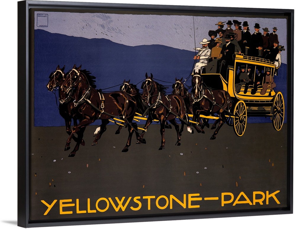 <p>Old advertising print for U.S. National park that extends into Wyoming, Montana, and Idaho with the image of a horse drawn carriage carrying several people with a silhouette of mountains in the background.</p>