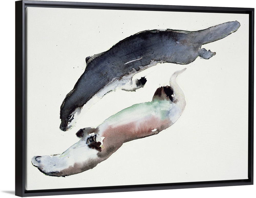 <p>Contemporary wildlife painting of two river otters swimming.</p>