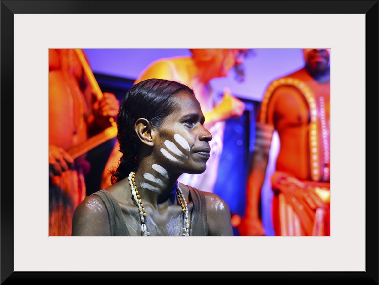 <p>Yirrganydji Aboriginal woman and men during cultural show in Queensland, Australia.</p>