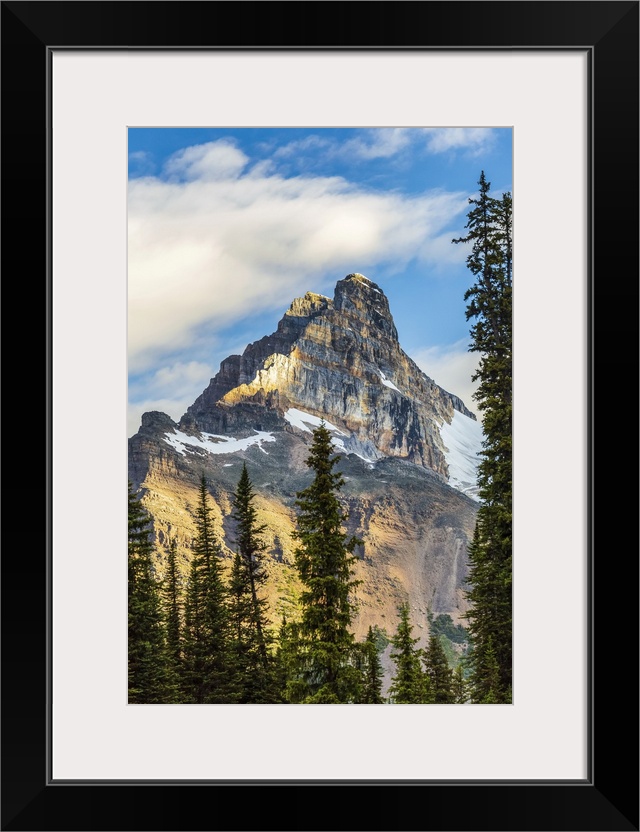 <p>Mountain cliff peak dramatically lit by the sun with blue sky and clouds, Yoho National Park; Field, British Columbia, Canada</p>