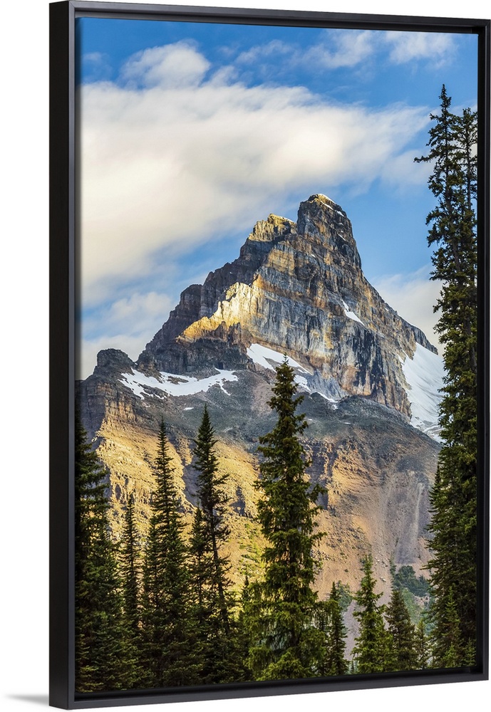 <p>Mountain cliff peak dramatically lit by the sun with blue sky and clouds, Yoho National Park; Field, British Columbia, Canada</p>