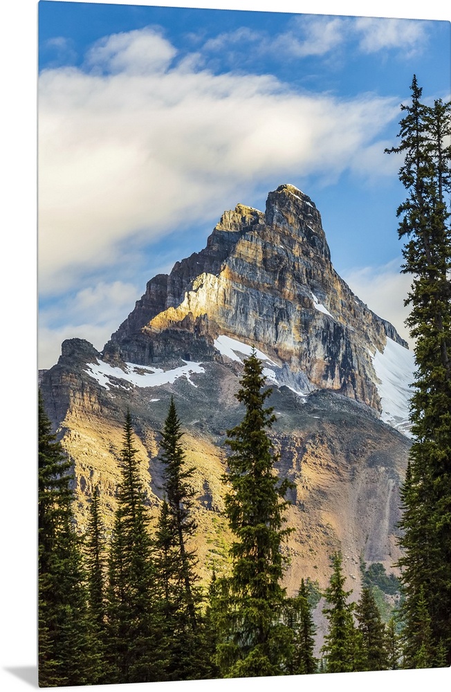 <p>Mountain cliff peak dramatically lit by the sun with blue sky and clouds, Yoho National Park; Field, British Columbia, Canada</p>