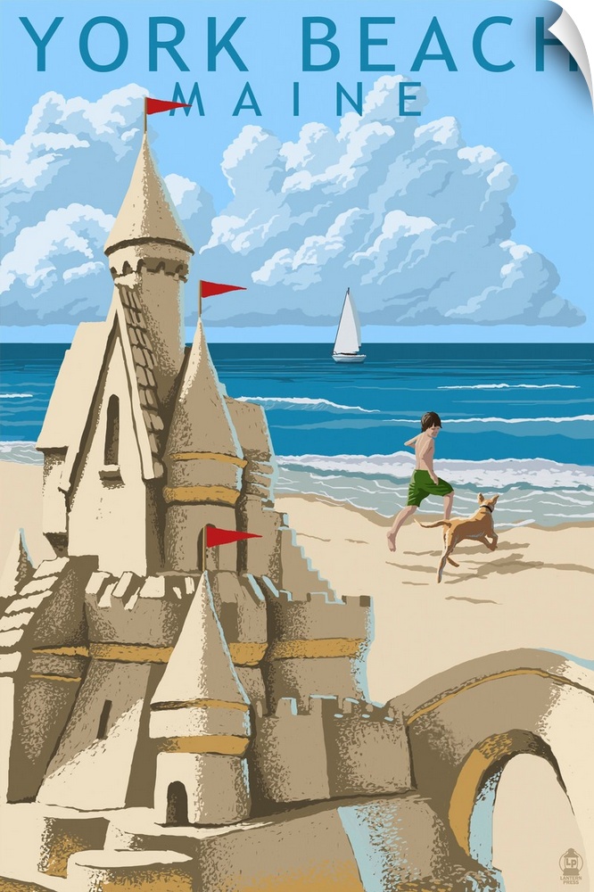 <p>Retro stylized art poster of sand castle on a beach, with a child and dog playing in the background.</p>