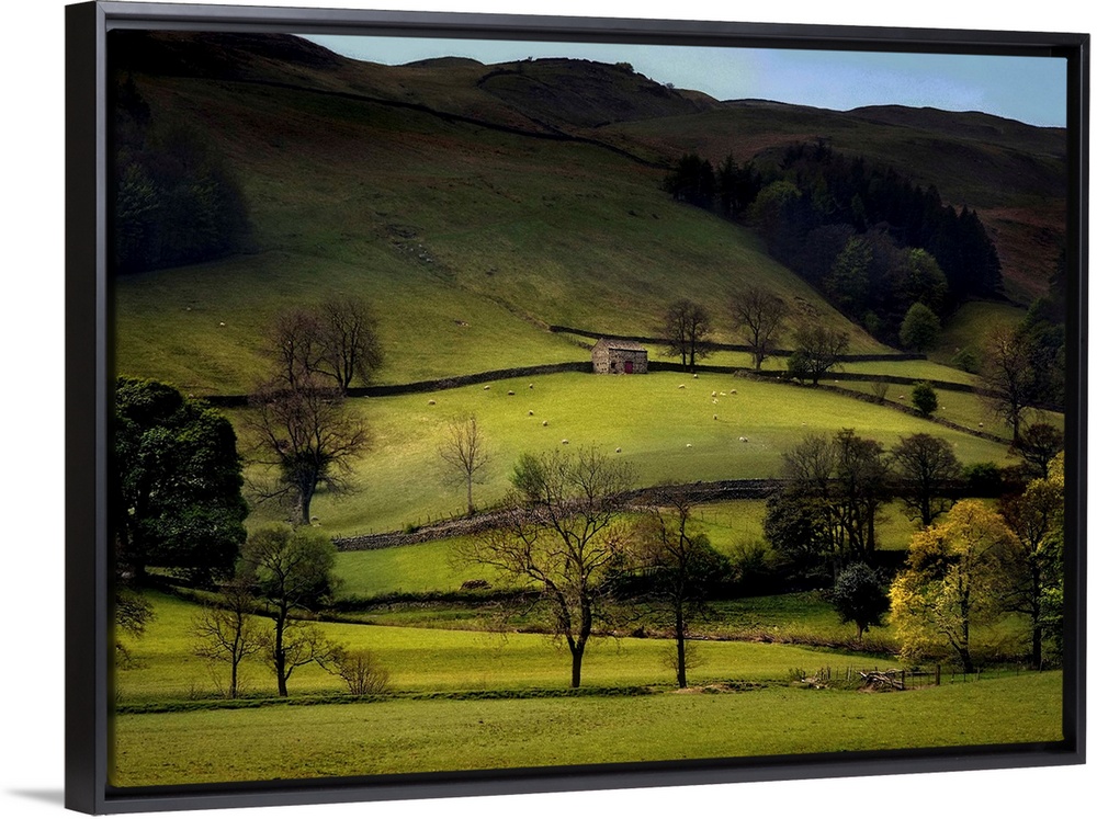 <p>Rolling fields in the Yorkshire dales with stone walling and a barn</p>