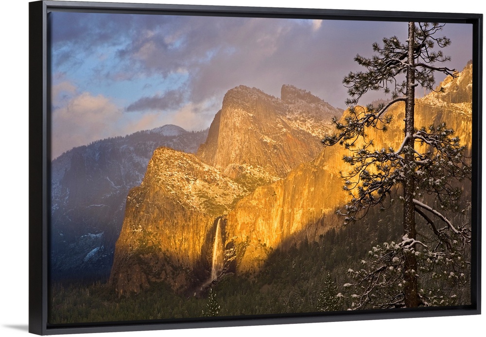 <p>Large canvas photo print of big rugged mountains with a waterfall highlighted with the warm colors of a setting sun.</p>