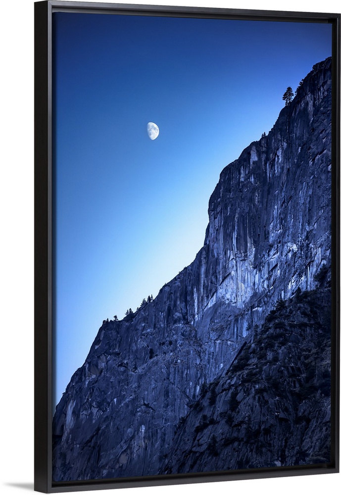 <p>The moon in the sky over the side of a mountain in Yosemite National Park, California.</p>