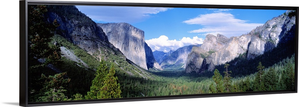 <p>Wide angle photograph of tree tops in a valley surrounded by mountains, beneath a blue sky, in Yosemite National Park, California.</p>
