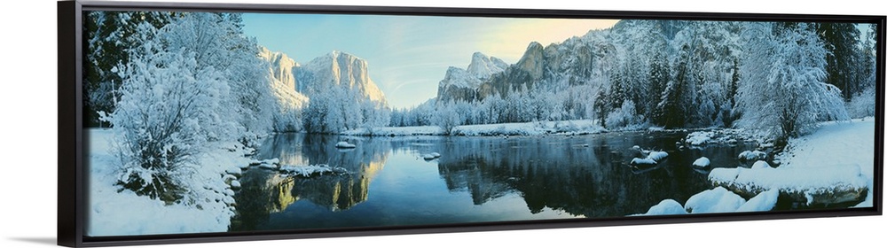 <p>Giant, panoramic photograph of calm waters surrounded by snow covered trees and mountains in Yosemite National Park, California.</p>