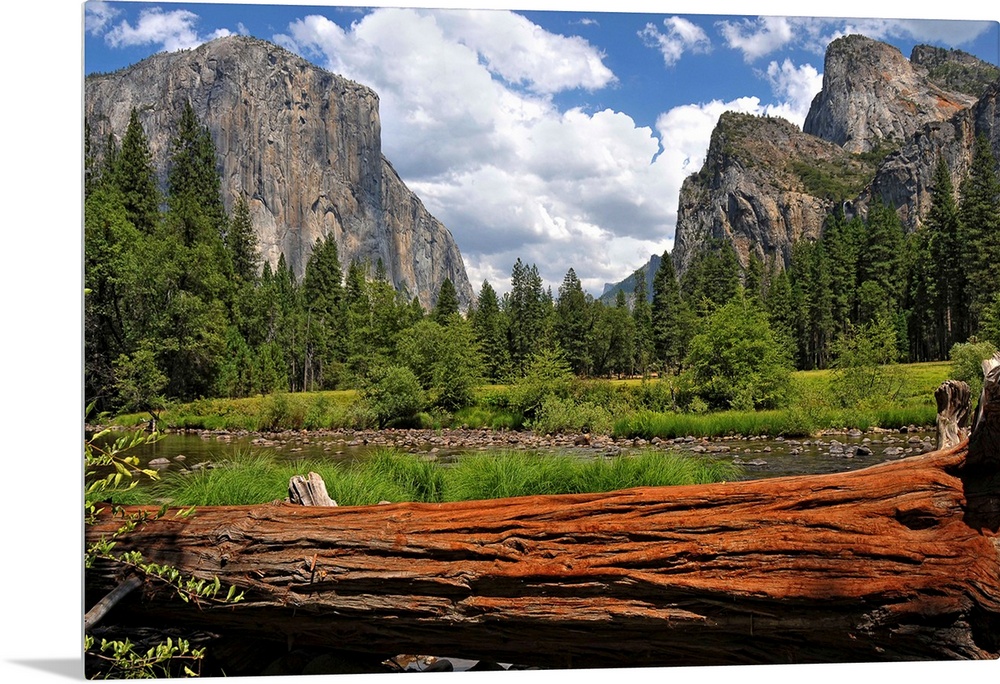 <p>Giant photograph of Yosemite Valley on a sunny day with a fallen tree trunk and pond in the foreground with an evergreen forest and looming mountains in the background.</p>