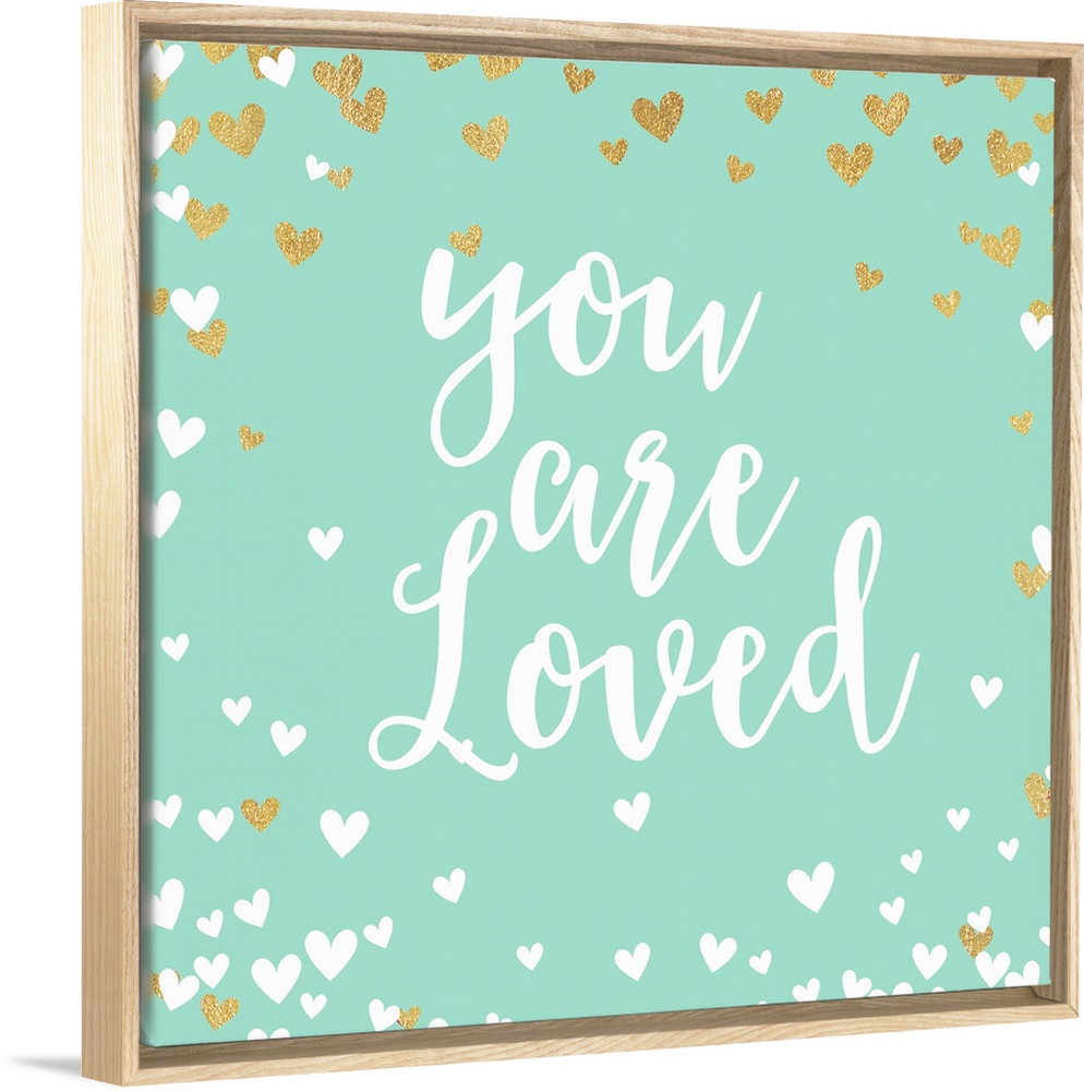 <p>"You are loved" in script text on turquoise with white and gold hearts.</p>