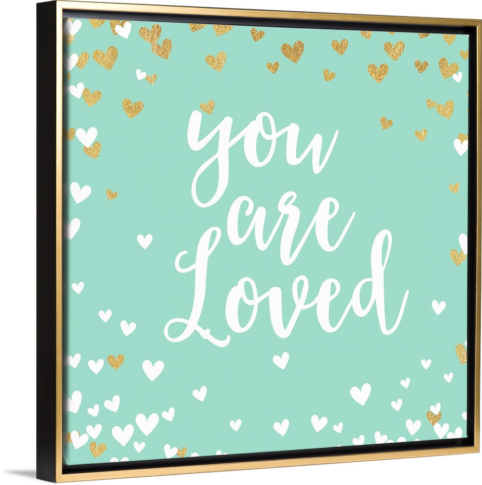 <p>"You are loved" in script text on turquoise with white and gold hearts.</p>