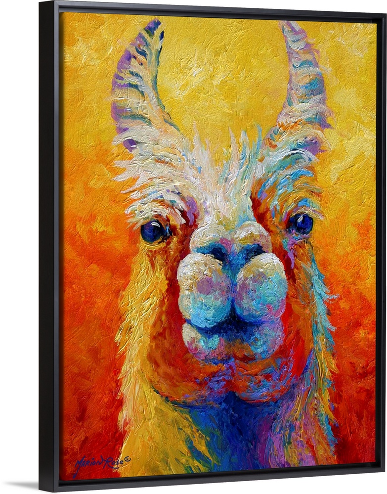 <p>Colorful painting looking straight on at the face of a llama with his ears sticking straight up.</p>