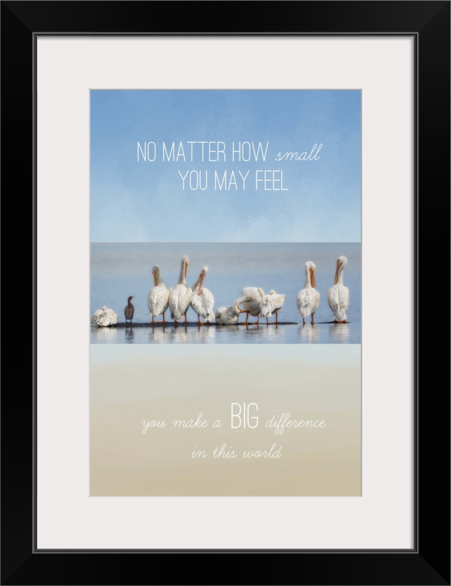 <p>A line of white pelicans on the beach with the text "No matter how small you may feel, you make a big difference in this world."</p>