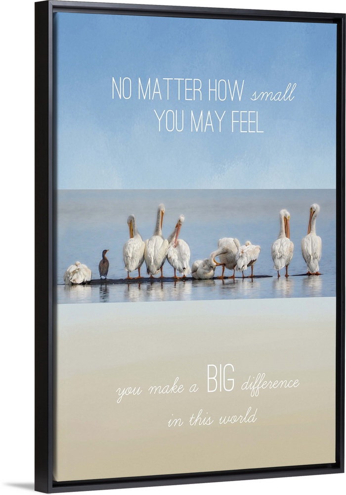 <p>A line of white pelicans on the beach with the text "No matter how small you may feel, you make a big difference in this world."</p>