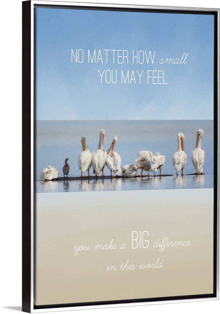 <p>A line of white pelicans on the beach with the text "No matter how small you may feel, you make a big difference in this world."</p>