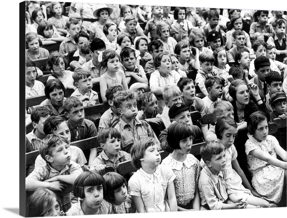 <p>4th August 1937: A crowd of children enjoy entertainment provided by London County Council (LCC) at Clapham Common, south London The children are blowing while a conjuring trick is done</p>
