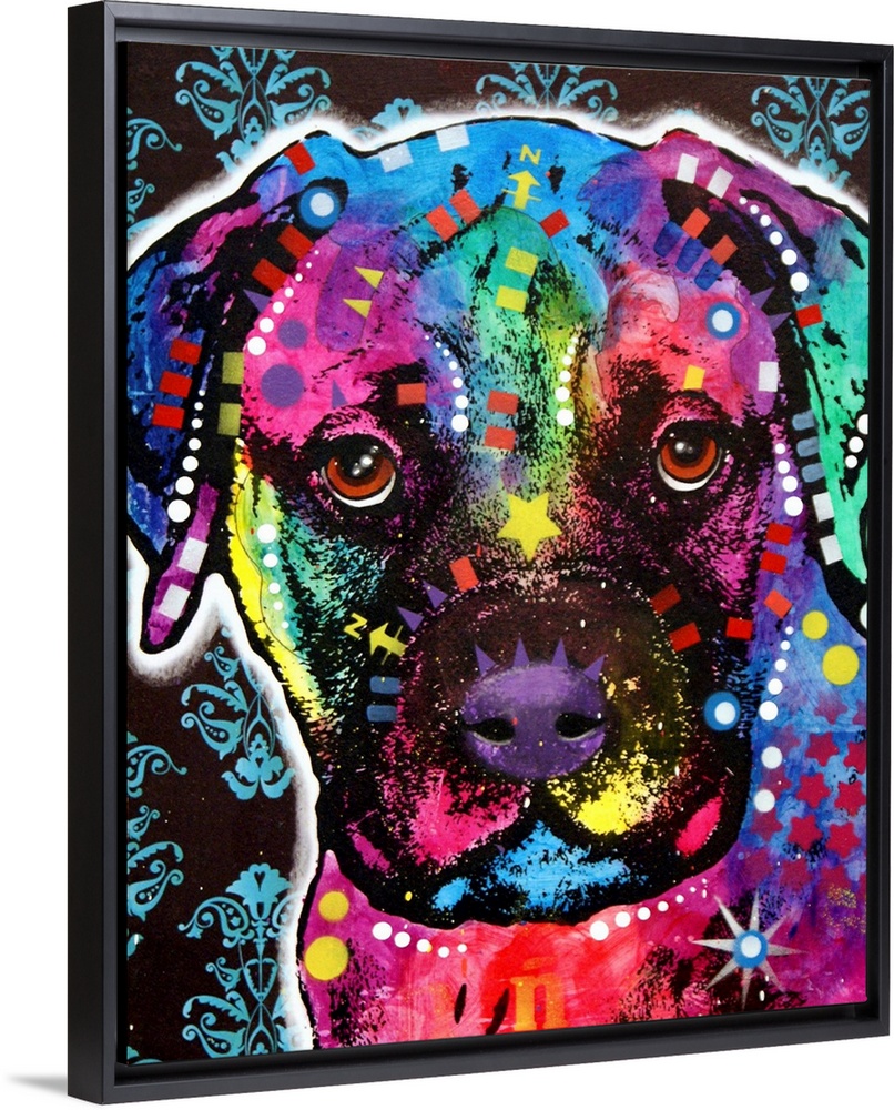 <p>Contemporary stencil painting of a bullmastiff filled with various colors and patterns.</p>