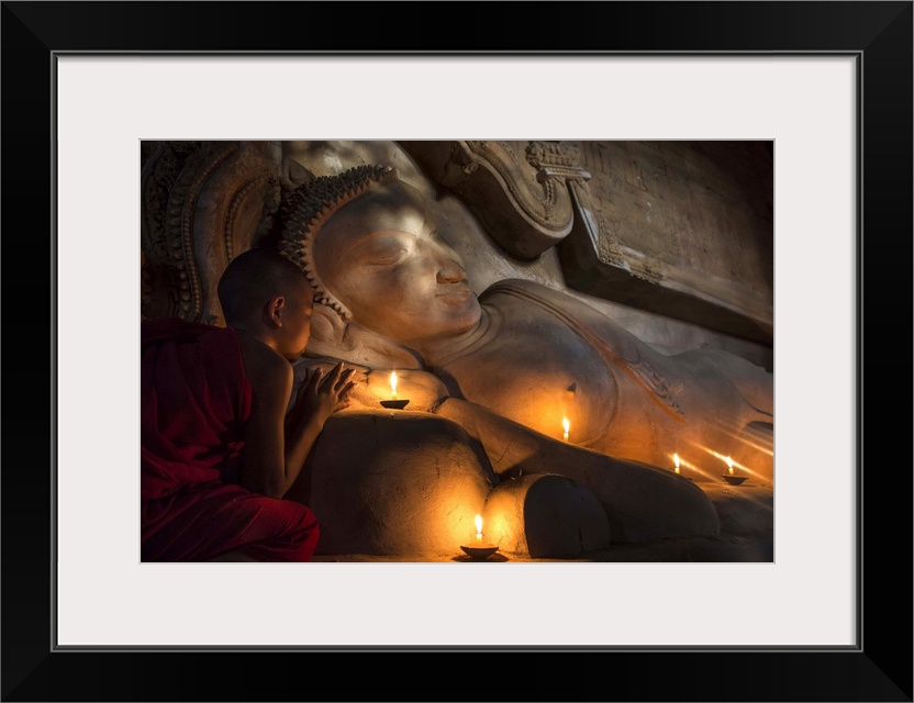 <p>Young Burmese monk praying by candlelight by large reclining Buddha.</p>