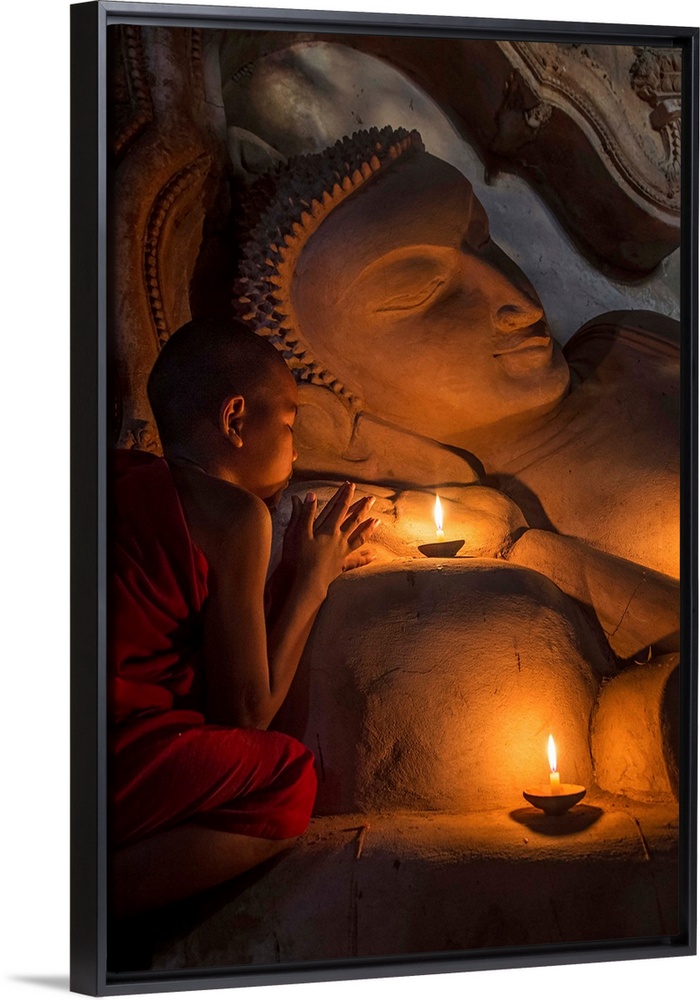 <p>Young Burmese monk praying by candlelight by large reclining Buddha.</p>