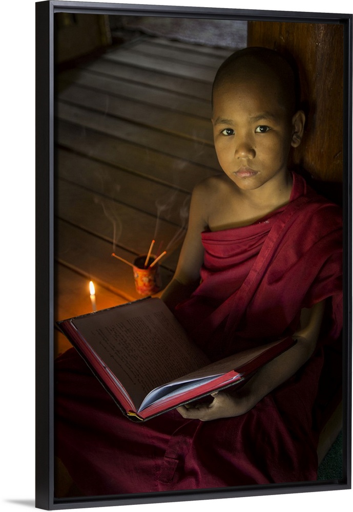 <p>Young Burmese monk reading by candlelight</p>