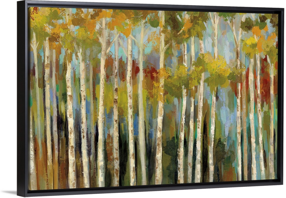 <p>Contemporary artwork of a forest of thin birch trees in fall colors.</p>