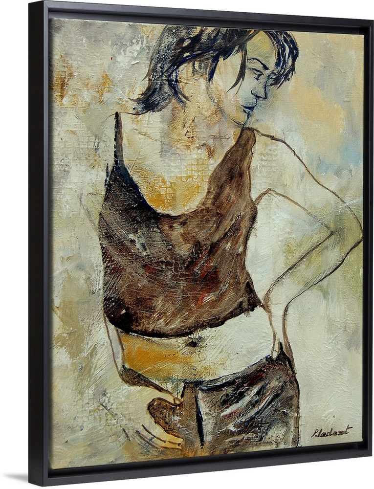 <p>A portrait of a woman standing with her hand on her hip, painted in textured neutral colors with orange accents.</p>