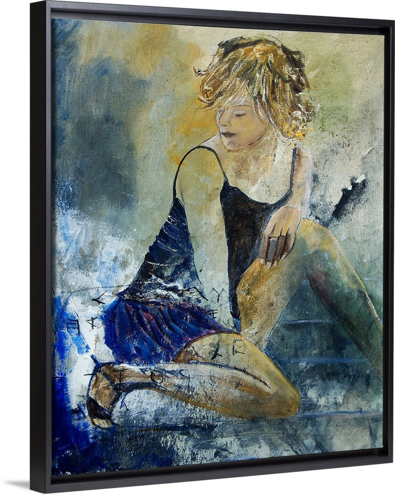 <p>A portrait of a woman in a dress, sitting with one hand between her legs, painted in textured colors of blue and brown.</p>