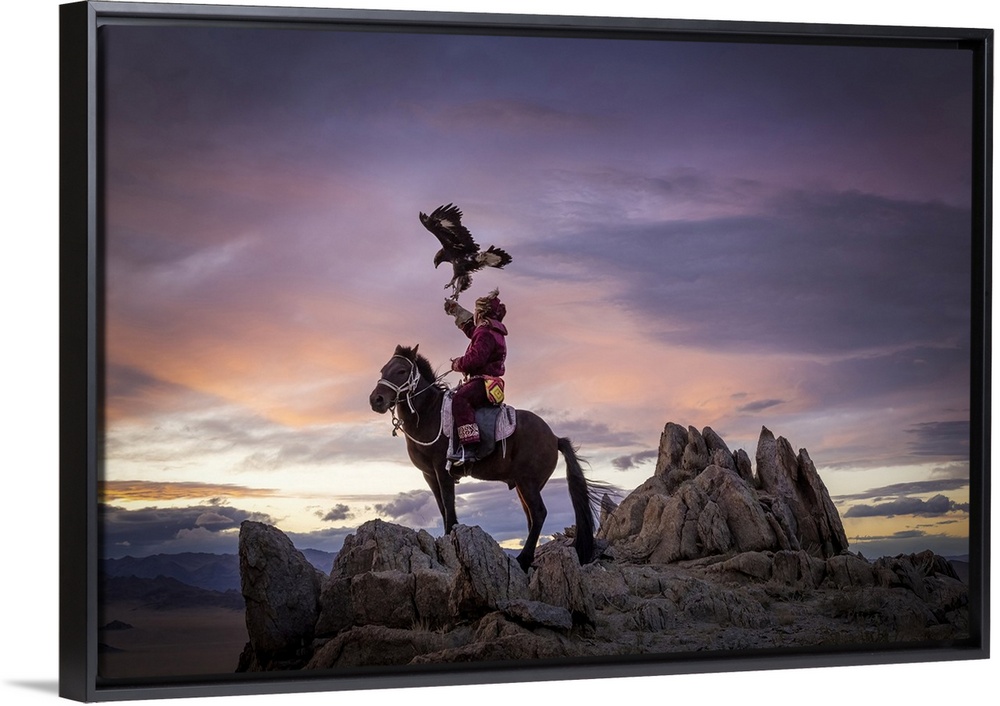 <p>Young Kazakh Eagle Hunter on horseback with his Golden Eagle, at sunset, Altai Mountains, Western Mongolia, Asia</p>
